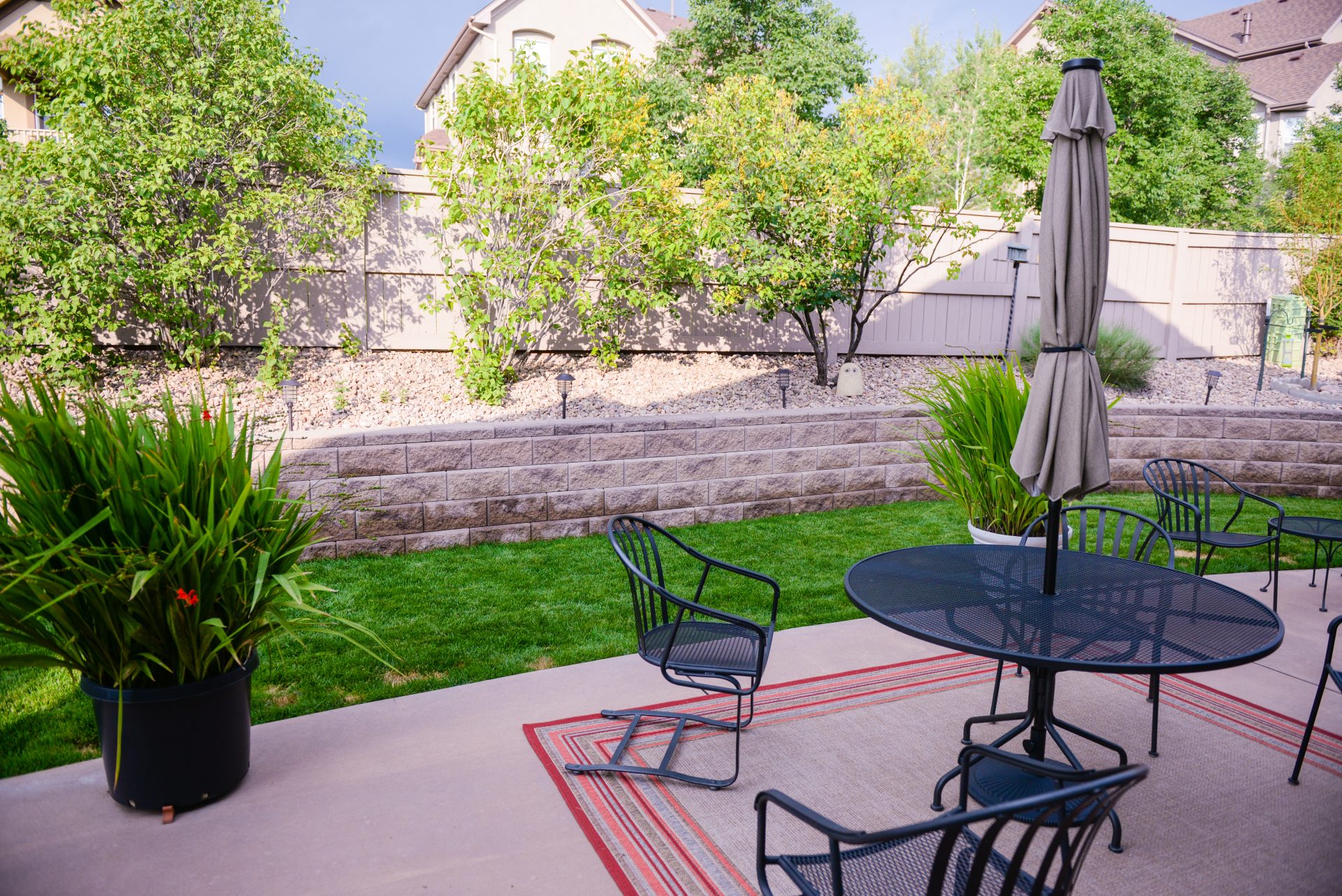 Our Sand Flower project brings clean definition to the backyard with a sweeping retaining wall that creates a polished, terraced look. Fresh sod adds a soft, inviting lawn, while simple plantings and rock accents keep the space low-maintenance and tidy. The result is a balanced outdoor setting—perfect for everyday use, relaxing, and easy entertaining.